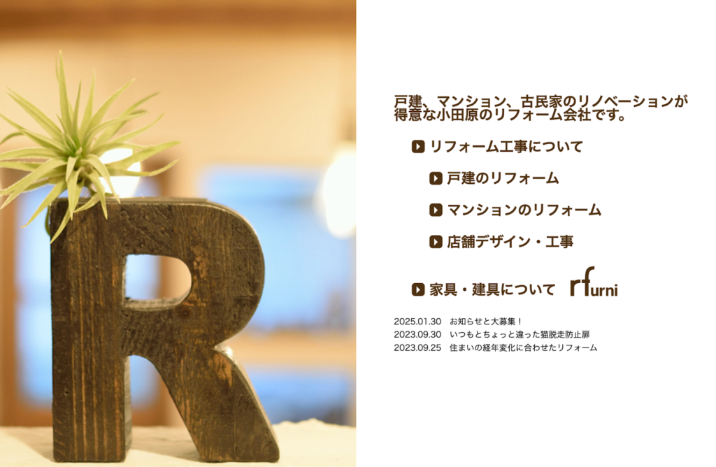 アールリフォーム工房の案内では、神奈川県小田原市でリフォームやリノベーション、家具や建具の製作にも対応すると記載されています。
