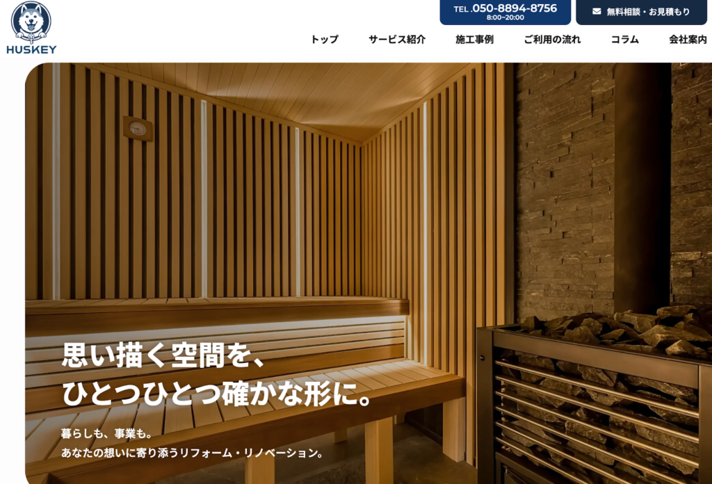 株式会社HUSKEYは、住宅リフォームに加えて、ペットと暮らす空間設計、自宅サウナの設置、宿泊施設・店舗のリノベーションまで扱う点が特徴です。